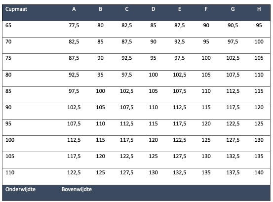Avec le tableau ci-dessous, vous pouvez déterminer très facilement la taille de soutien-gorge de votre GenericProductName. Garde à l’esprit que le tableau ci-dessous est une ligne directrice. La taille exacte du soutien-gorge dépend de la forme des seins, mais peut aussi varier selon la marque et le modèle.